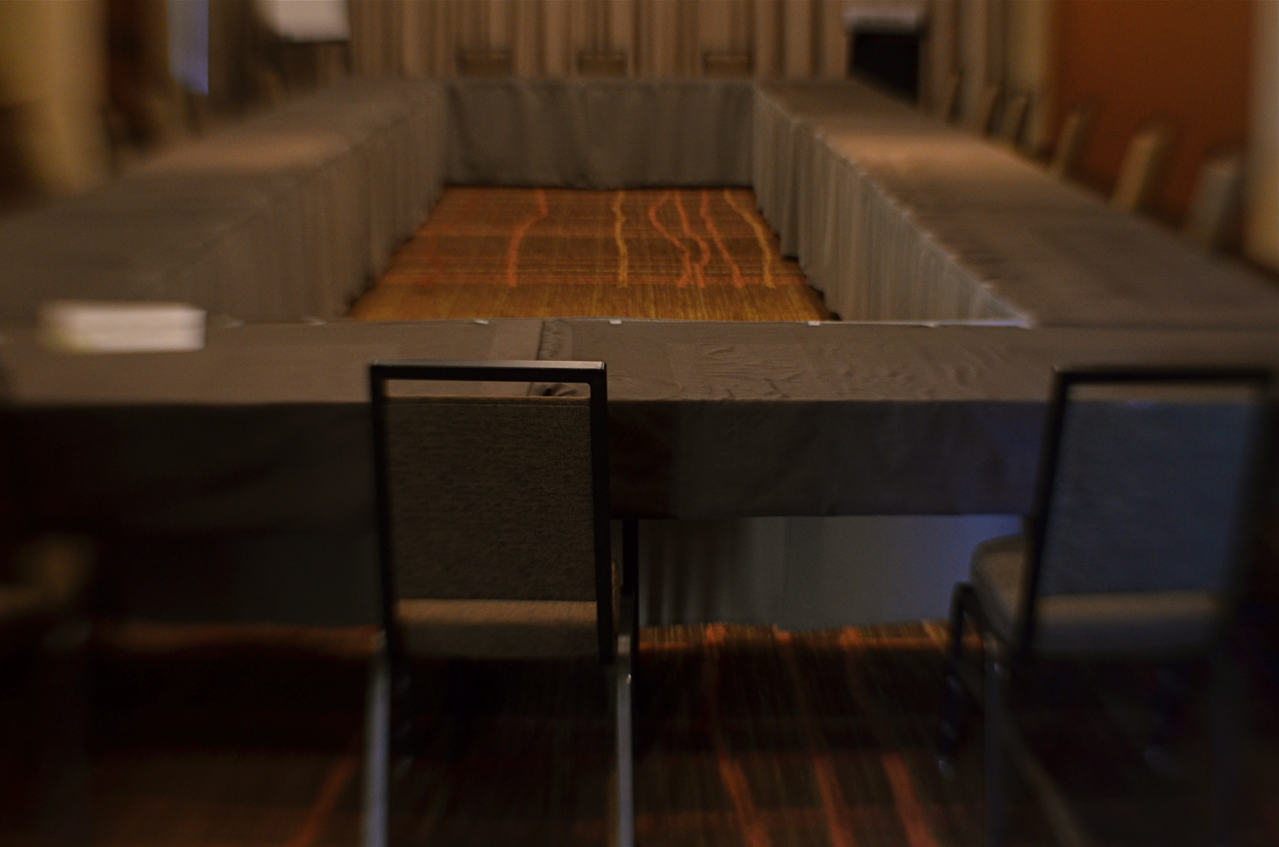 I don’t know why the meeting room shown here, which was being prepared for a conference later in the day, struck me. It might have been the somber color scheme, or the subdued light. It may have been the grand emptiness of it all; a room designed to be packed with people, sitting there, waiting for them to animate it. I just know that it was enough to slow my trek through a resort hotel long enough to try to show that potential. For what? A moment of high corporate drama? The end of someone’s career, the launch pad for a bold new idea? The meeting that might redraw the map of human destiny? Or nothing?