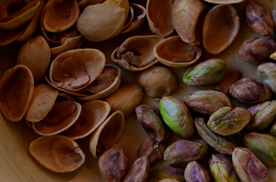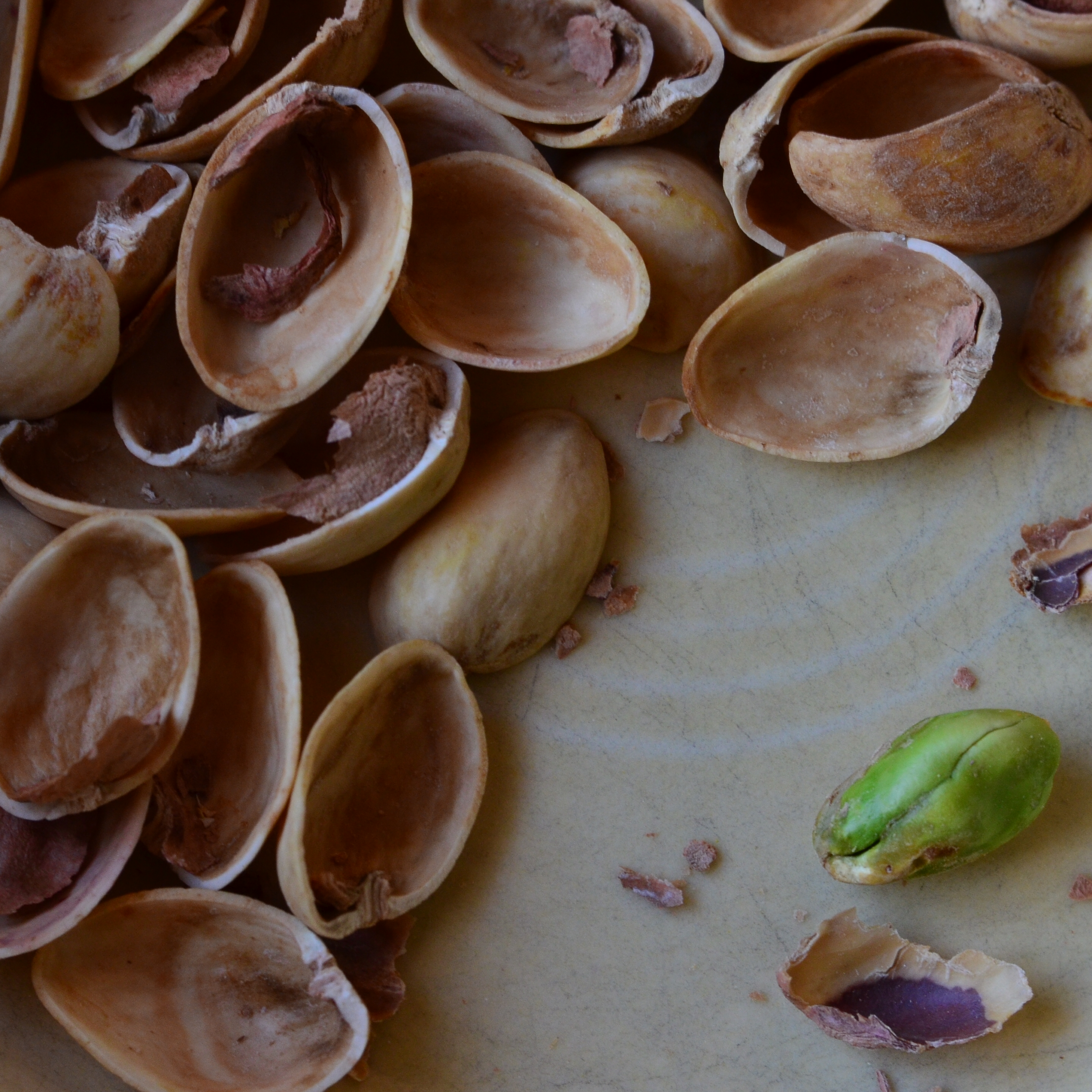 For comparison, in the second frame, the terms of engagement are completely different. The pile of shells at left is more sharply contrasted with the single nut at right. The nut carries the only vivid color in the image; it’s an outlier, a misfit…maybe the last man/nut standing? The simplification of the composition lets it breathe a little, allowing the viewer to speculate, invent. Are the shells symbolic of a mound of nuts that have already been polished off in some grand snacking orgy? Why was one lone nut left to tell the tale? And so on.