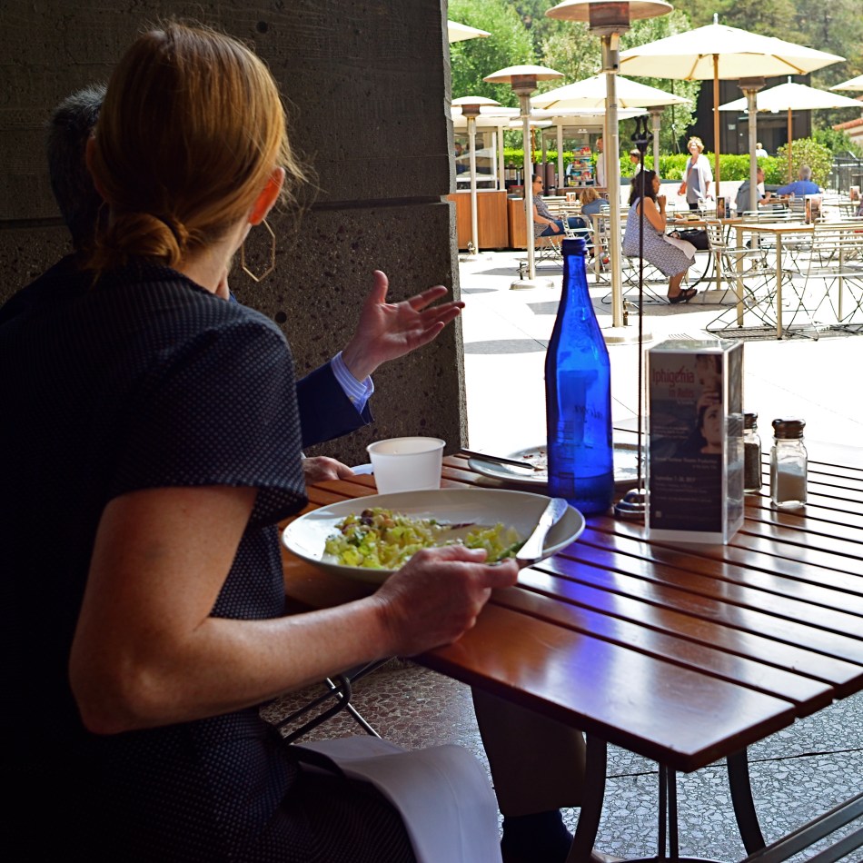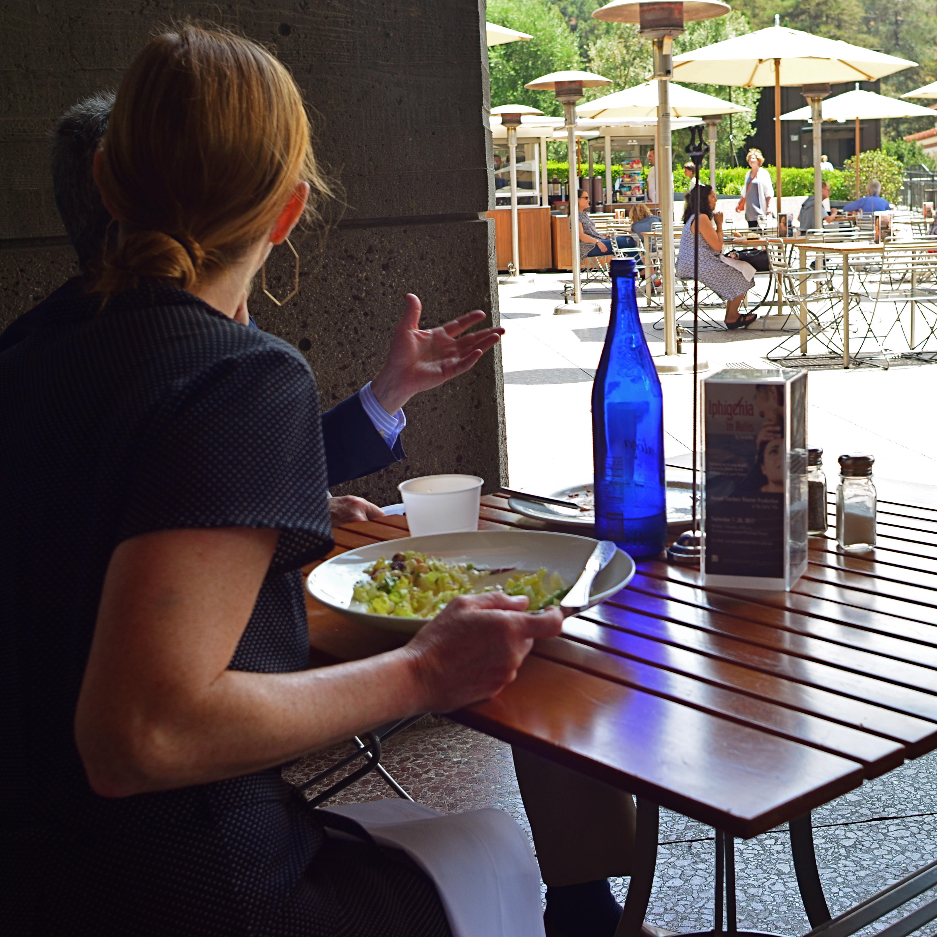 The above image illustrates this strange mis-match between storytelling and story material. As a shooter, I’m tantalizingly close to the couple at the table next door to me at a plaza restaurant. I mean, I can practically count the salt grains on the lady’s salad. I can also tell, by her male companion’s hand gestures, that a lively conversation is underway. But that is the sum total of what I know. I can’t characterize the discussion. A business planner? A lover’s quarrel? Closing the sale? Sharing some gossip? Completely unknown. Sure, I could strain to pick up a word here or there, but that alone may not be enough to provide any additional context, and, in fact, I don’t need that information to make a picture.