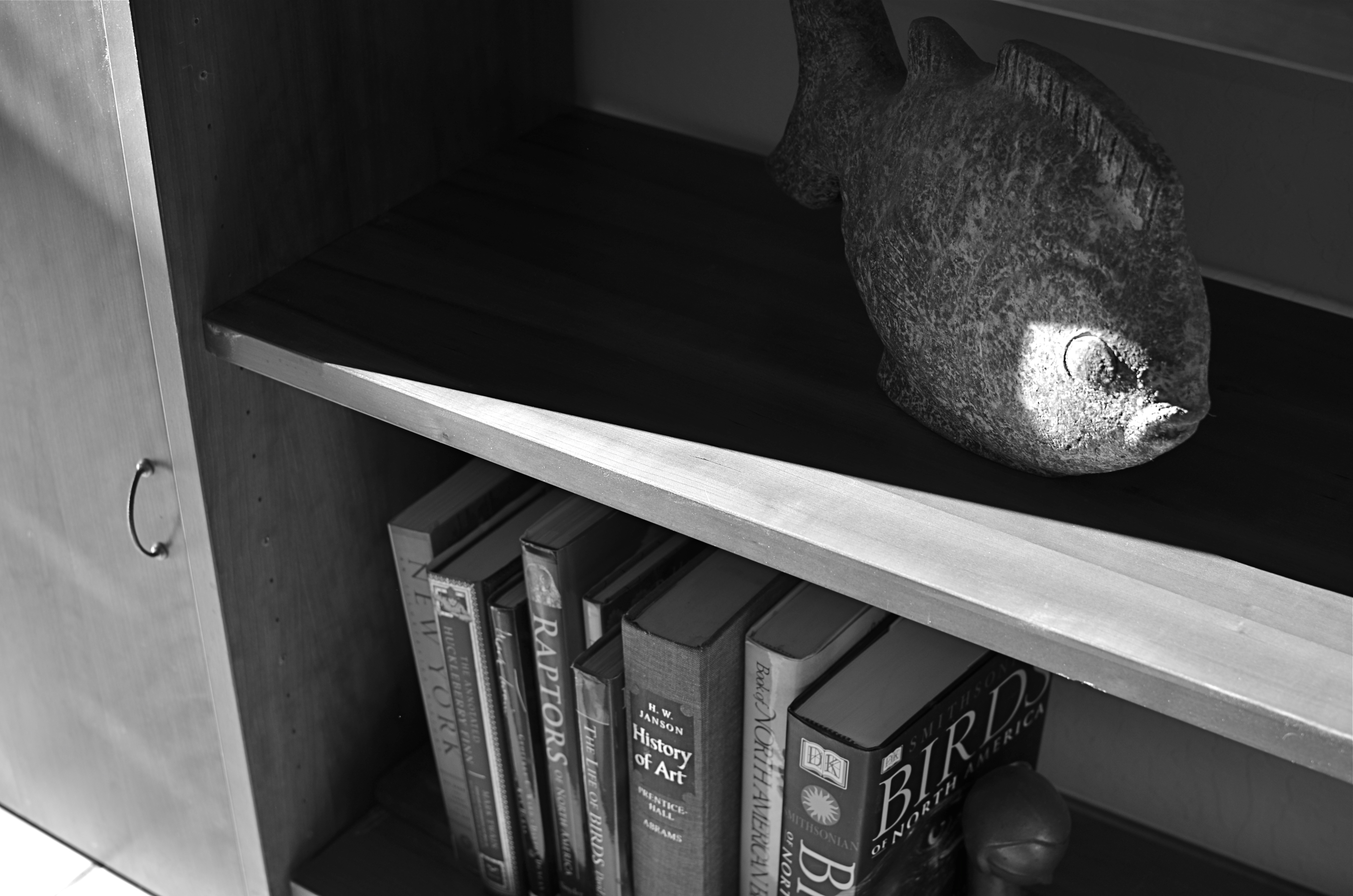 Bending a simple white stationery envelope into a “L”, I popped up my camera’s flash and covered the unit with the corner of the envelope where the two planes intersected. The flash was scooped up by the envelope, then channeled over my shoulder, blowing onto the wall at my back, then bouncing back toward the fish in softened condition near the underside of the shelf, allowing just enough light to allow the figure’s bright nose to taper back gradually into shadow, revealing additional texture, but not over-illuminating the area. It took about five tries to get the thing to look as if the light could have broken that way naturally. Fast, cheap, effective.