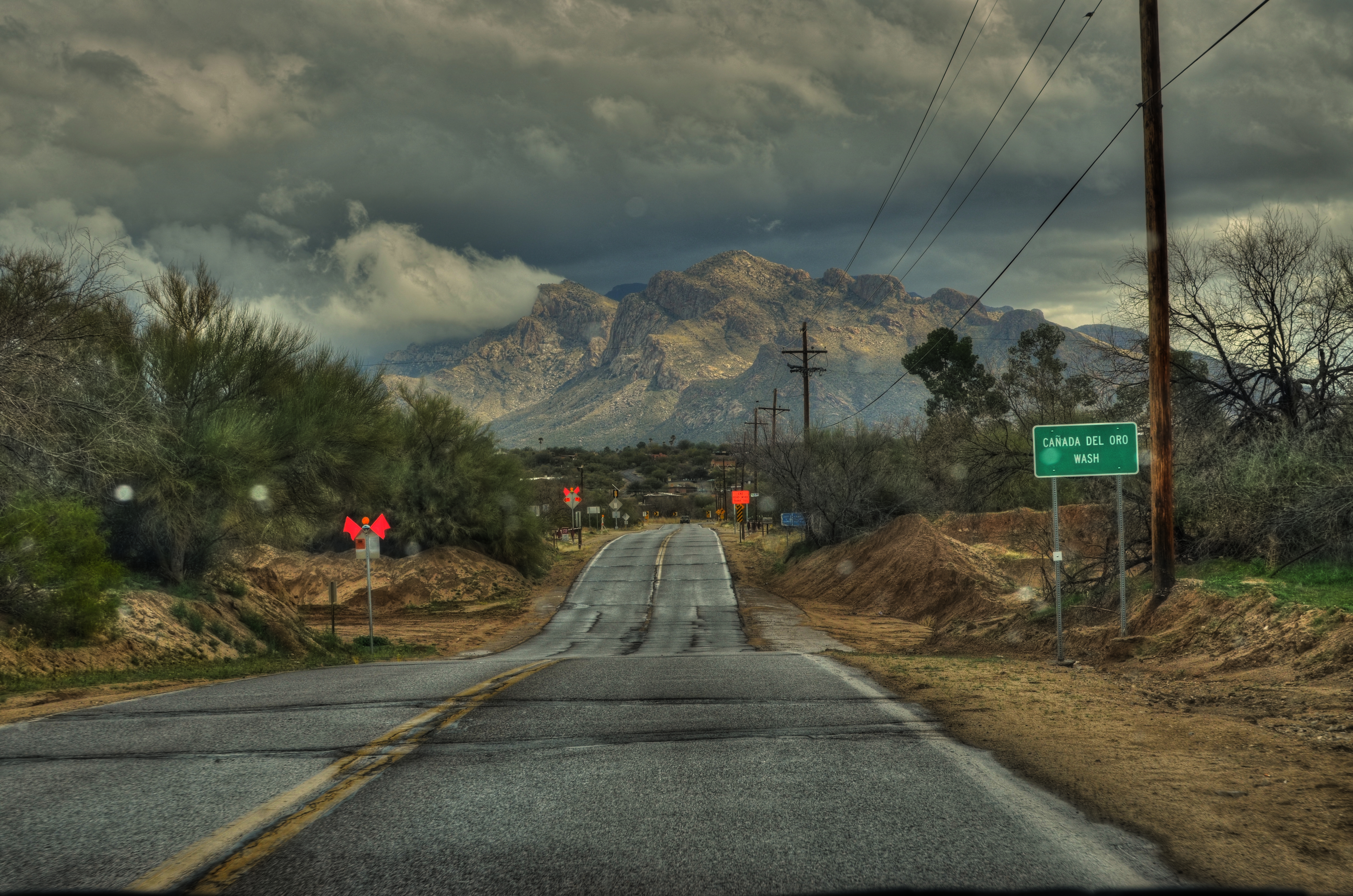 One of the rural roads we drifted down, before realizing our error, led us to a stunning view of the back end of Tucson’s Catalina mountains, framed by small town activity, remnants of rainfall, and a portentous sky. I squeezed off a few shots straight out of the windshield and got what I call the “essence” exposure I needed. That single image was relatively well-balanced, but it wouldn’t show the full range of textures from the stormy sky and the mountains. Later, in post, I duplicated the one keeper frame that I got, modifying it in Photomatix, my HDR processing program. Adding underexposure, deeper contrast, and a slight rolloff of highlights on the dupe, I processed it with the original shot to get a composite that accentuated the texture of the clouds, the stone,, even the local foliage. A sheer “wild” shot had given me something that I would have totally missed if the car’s GPS had actually taken us to our “correct” destination.
