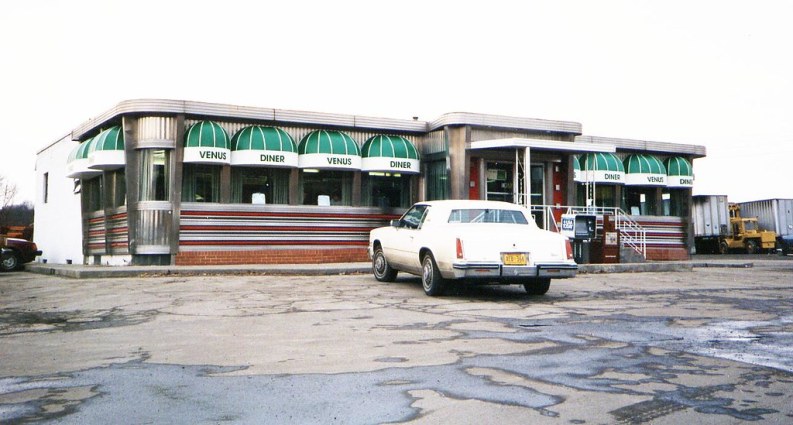 While most eating establishments are built like any other other structure, that is, on-site, working from a framework which is then layered over with different levels of support or decor, the classic American diner of the 20’s through the 50’s was produced modularly, much like an automobile. Indeed, the closest relative to the diner might be the Airsteam trailer, an edifice built as a single unit in a factory and shipped to its final destination. Over the half-century or so that diners dotted the national map, companies like Silk City, Kullman and Fodero manufactured compact, curvilinear eateries that were trucked, fully equipped inside and out, to their initial locations ready for business. Such was the origin of the diner you see in the above image (a Fordero diner…shout-out to New Jersey), which began its life near the Gibsonia exit of the Pittsburgh portion of the Pennsylvania turnpike. As the place was situated only seven miles from the neoghboring town of Mars, Pa., the diner’s owners decided to maintain the planetary theme, naming their joint the Venus.