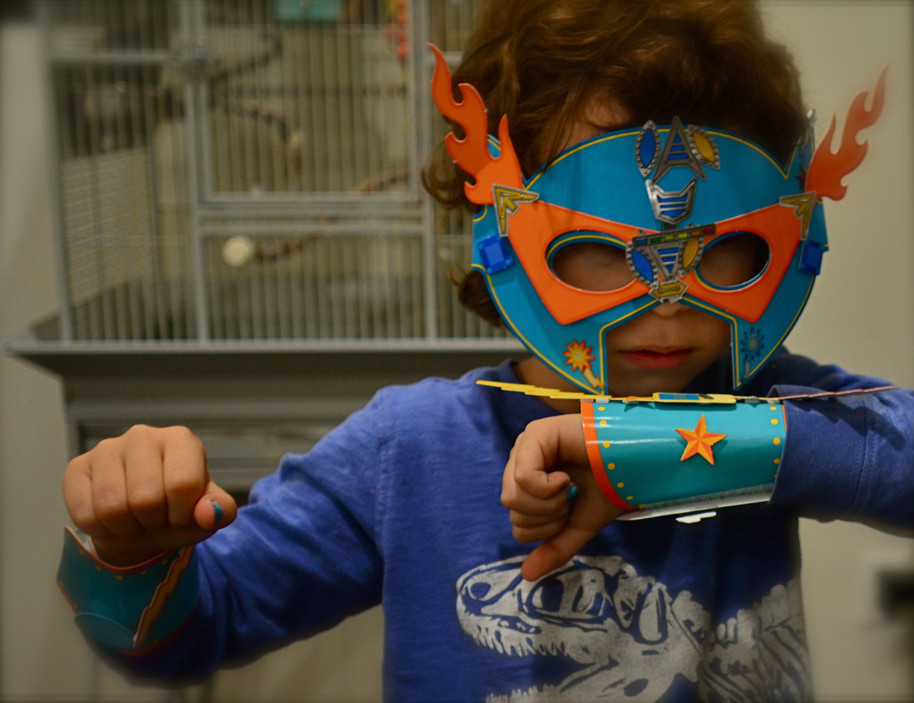 The young man you see here is dead serious about his idea of fun. He made the mask and cuff he’s wearing with his own hands, but that doesn’t render them any less miraculous. Once he’s put them on, he’s ready for reality to be altered into something useful, something fanciful. It doesn’t take much. Mom’s bath towel becomes Superman’s cape: a sock pulled over your hand becomes a sidekick, right down to his button eyes. And, apparently, there’s no disconnect between the space garb on his head and wrist and his regular dinosaur t-shirt. Consistency is for grown-ups, bah humbug.