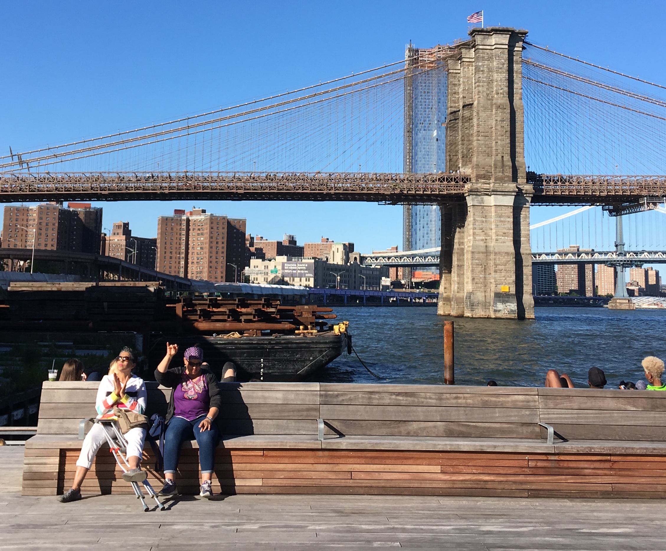 This view of the southern side of the Brooklyn Bridge certainly needs no additional context, and yet, the nearby Pier 17 promenade, repaired and re-imagined as all-new public space near the Fulton Street market region in the aftermath of Hurricane Sandy (and shown here), provides a daily flood of people-watching opportunity. Indeed, almost any other framing along the deck at the moment this shot was taken would show just how much company the ladies seen here actually had on this particular Saturday evening. The word throng definitely applied, with just about any other composition revealing hundreds of singles, couples, and families crowding the Pier’s restaurants, bars, kiosks, tour boats and viewing rails……however, we have decided, for the moment, to concentrate on these two ladies, and the bond of friendship that is more than enough story to power a photograph.